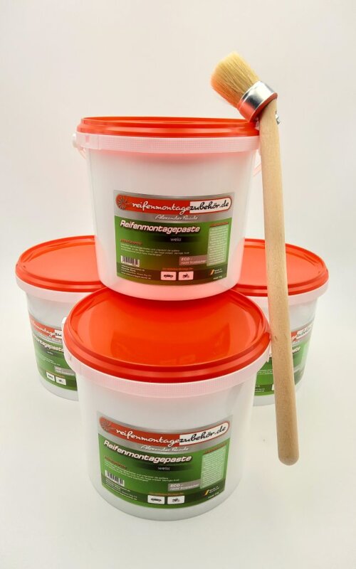 Aktionspaket: 4 Eimer Reifenmontagepaste Montierpaste weiß je 5kg (ECO) und ein Pinsel PKW und LKW Ø 40mm (Made in Germany)