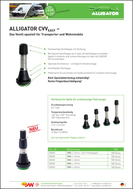 Alligator CVV-40 TR 413, Länge 40 mm, VL-ø 11,3 mm Spezialventil für Transporter und Wohnmobile bis 7 bar (1Stück)