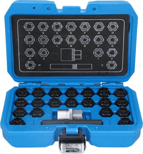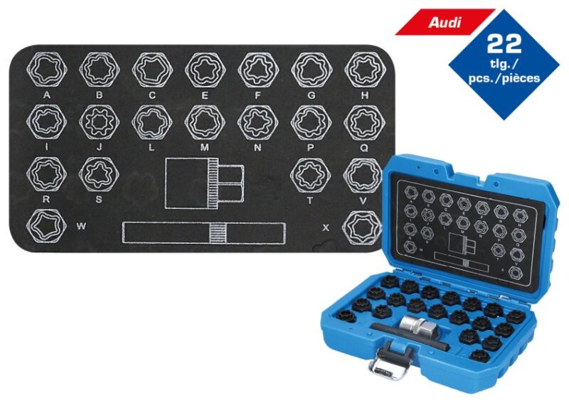 Audi BT691360 enthält 20 wesentliche Radmutter-Löseschlüssel zum beschädigungsfreien Öffnen von werksseitigen Felgenschlössern. Mit den Profilen A, B, C, E, F, G, H, I, J, L, M, N, P, Q, R, S, T, V, W, X ist er für viele Audi Modelle geeignet.