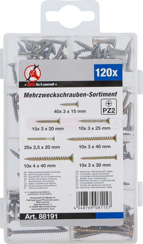 Mehrzweckschrauben-Sortiment | Kreuzschlitz PZ2 | 120 Stück