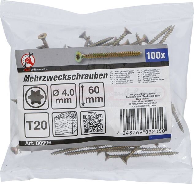 Mehrzweckschrauben | T-Profil (für Torx) T20 | 4,0 x 60 mm | 100 Stück