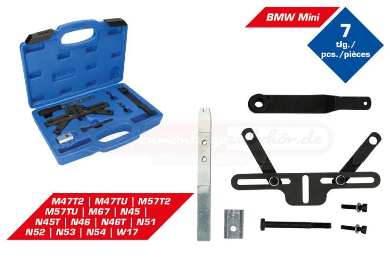 Mini W17 Diesel/Benzin Kettenantrieb-Motoren. Das Werkzeug kann auch verwendet werden, um das Schwungrad beim Entfernen der Steuerkette für Zylinderkopfreparaturen zu halten. Das Werkzeug wird in einem Kunststoffkoffer geliefert.