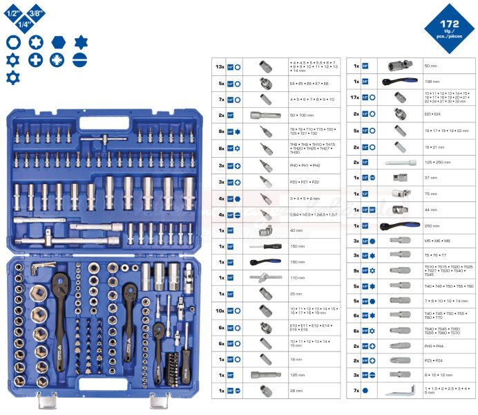 - 172-teiliges Steckschlüssel-Set 1/4" (6,3 mm), 3/8" (10 mm), 1/2" ( 12,5 mm)