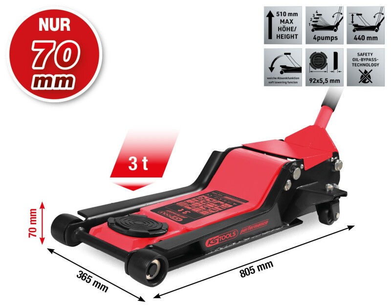 performance Hydraulischer Stahl-Wagenheber, 3000 kg, extra flach, Hubhöhe: 70-510 mm